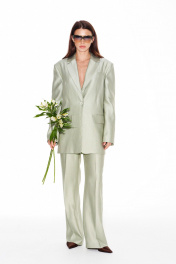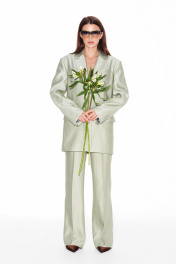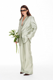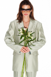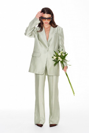 Жакет свободного объема, прямого силуэта, с центральной застежкой на 1 петлю и 1 пуговицу, отложным воротником и лацканами пиджачного типа, на подкладке. Детали переда с талиевыми вытачками, отрезными бочками и прорезными карманами с клапанами и двумя обтачками. На левой полочке — нагрудный карман с листочкой. Спинка со средним швом, отрезными бочками и шлицей. На левой детали спинки выполнен декоративный карман с двумя обтачками. Рукав втачной, двухшовный, длинный. В локтевых швах — функциональные шлицы, застегивающиеся на 4 петли и 4 пуговицы.