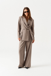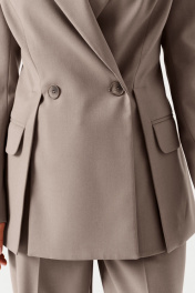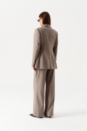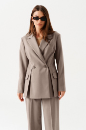 Комплект женский 2-х предметный из костюмной ткани, состоящий из жакета и брюк. Жакет полуприлегающего силуэта, на подкладке, с центральной двубортной застежкой на петли и пуговицы, отложным воротником и лацканами пиджачного типа. По переду – прорезные карманы с клапанами и двумя обтачками, рельефы, переходящие в шлицы. Спинка со средним швом, рельефами, выходящими из проймы. Рукав втачной, двухшовный, длинный. Брюки прямого силуэта, с отложной деталью на поясе. На передних и задних половинках заутюжены стрелки. На задних половинках талиевые вытачки. Пояс отрезной, притачной. Застежка пояса на петлю и пуговицу. Застежка брюк – гульфик на молнии.
