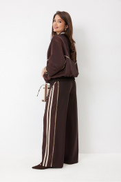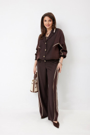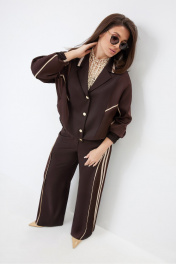Костюм женский, состоящий из жакета и брюк. Жакет прямого силуэта со спущенной линией плеча, что обеспечивает свободное и комфортное ношение. Воротник пиджачного типа. Рукав втачной трехшовный длинный, завершающийся притачной манжетой с резинкой для удобства. Спинка с вертикальными рельефами. Боковые части спинки подрезами. Передняя часть с центральной бортовой застежкой на кнопках, боковые карманы с листочкой и декоративными подрезами. Низ жакета разноуровневый. По низу и боковым частям спинки притачные планки с резинкой. Жакет на подкладке для комфортного ношения. В брюках прямой силуэт. Брюки на притачном поясе с резинкой и кулисой. Передняя часть брюк с имитацией гульфика, что добавляет визуальных линий. В боковых участках расположены фигурные вставки с декоративными элементами в виде лампас. Декоративные канты, выполненные из отделочной ткани, украшают боковые вставки и придают завершенность образу. Комфортный и стильный женский костюм, выполнен из двух видов ткани: классической костюмной и элегантной сатиновой.