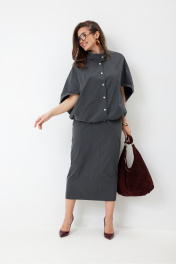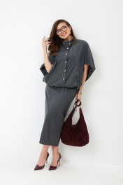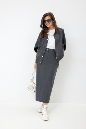 Комплект женский, состоящий из пыльника и юбки. Пыльник дизайнерского кроя в стиле «конверт» с центральной бортовой застежкой на кнопки и воротником-стойкой. Рукав цельнокроенный, что обеспечивает комфорт. Карманы расположены в швах и рельефах переда, добавляя визуальные акценты и функциональность. Юбка прямого силуэта с застежкой-гульфиком на тесьму-молнию и кнопку. Юбка на притачном поясе с резинкой по боковым частям переда и спинки. Задняя часть юбки с талиевыми вытачками и горизонтальным подрезом ниже уровня бедер. Нижняя часть спинки выполнена на запах. Передняя часть юбки с боковыми карманами. Этот комплект гарантирует комфорт в носке и привлекательный внешний вид.