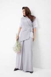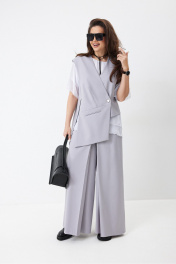 Комплект женский, состоящий из жилета, брюк и блузы. Жилет прямого силуэта с V-образным вырезом горловины имеет спинку со среднем швом и асимметричным низом. Перед с двубортной застежкой на петли-пуговицы. Низ переда асимметричный и разноуровневый. На средней части переда имитация кармана "в рамку", добавляющая интересный акцент к модели. Блуза прямого силуэта с круглым вырезом и коротким втачным одношовным рукавом выполнена с двойными деталями. Перед, спинка и рукав имеют разноуровневый низ с открытым срезом. Брюки прямого, свободного силуэта, с притачным поясом и резинкой в области боковых участков переда и спинки обеспечивают комфорт и хорошую посадку. Задняя часть брюк с талиевыми вытачками, а перед — с боковыми карманами. Размер 46: Жилет: ОГ-104, ОТ-106, ОБ-108, ширина плеча-16, ширина изделия спинки-39, длина изделия спинки по шву-59. Блузка: ОГ-110, ОТ-112, ОБ-116, ширина плеча-12, ширина рукава на уровне ОП-19, ширина изделия спинки-41, длина изделия спинки-65. Брюки: ОТ в собр.-62, ОТ в раст.-100, ОБ-108, ширина изделия по низу-46, длина изделия по боковому шву с поясом-110. Размер 48: Жилет: ОГ-108, ОТ-110, ОБ-112, ширина плеча-16, ширина изделия спинки-39, длина изделия спинки по шву-59. Блузка: ОГ-114, ОТ-116, ОБ-120, ширина плеча-12, ширина рукава на уровне ОП-20, ширина изделия спинки-41, длина изделия спинки-65. Брюки: ОТ в собр.-66, ОТ в раст.-104, ОБ-112, ширина изделия по низу-47, длина изделия по боковому шву с поясом-110. Размер 50: Жилет: ОГ-112, ОТ-114, ОБ-116, ширина плеча-17, ширина изделия спинки-42, длина изделия спинки по шву-59. Блузка: ОГ-118, ОТ-120, ОБ-124, ширина плеча-12, ширина рукава на уровне ОП-21, ширина изделия спинки-43, длина изделия спинки-65. Брюки: ОТ в собр.-70, ОТ в раст.-108, ОБ-116, ширина изделия по низу-48, длина изделия по боковому шву с поясом-110. Размер 52: Жилет: ОГ-116, ОТ-118, ОБ-120, ширина плеча-17, ширина изделия спинки-42, длина изделия спинки по шву-59. Блузка: ОГ-122, ОТ-124, ОБ-128, ширина плеча-12, ширина рукава на уровне ОП-22, ширина изделия спинки-43, длина изделия спинки-65. Брюки: ОТ в собр.-74, ОТ в раст.-112, ОБ-120, ширина изделия по низу-49, длина изделия по боковому шву с поясом-110.