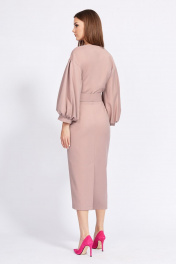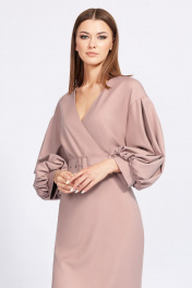 Платье выполнено из плательной ткани. Платье полуприлегающего силуэта, отрезное по линии талии, длиной миди. Перед лифа выполнен на "запах". Горловина V-образной формы. Плечевой шов спущен. Пройма углублена. Рукав рубашечного покроя, одношовный, длиной 3/4, с двумя встречными складками по окату и со сборкой по низу. Низ рукава на манжете. Юбка заужена к низу. Сзади шлица в среднем шве. В боковом шве застежка на потайную молнию. В комплект входит ремень из основной ткани с обтяжной пряжкой. Длина платья: р.44-48 - 123 см, р.50-54- 124 см. Длина рукава: р.44-48 - 64 см, р.50-54 - 65 см.