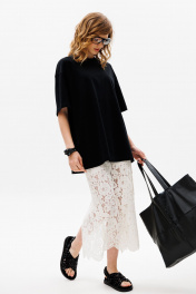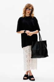 Джемпер выполнен из трикотажного полотна в виде футболки покроя "oversize", длиной ниже линии бедер. Горловина округлой формы, обработана бейкой. Плечевой шов спущен. Рукав одношовный, длиной до линии локтя. Длина джемпера: 74 см Длина рукава: 46 см.Гарантийный срок не установлен ГОСТ 31409-2009 44 46 48 Длина по центру спинки 74 74 74 Длина рукава от горловины 46 46 46 Объем по груди 130 134 138 Объем по талии 126 130 134 Объем по низу 126 130 134 Объем рукава вверху 50 52 54 Объем рукава внизу 41 42 43