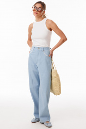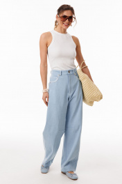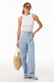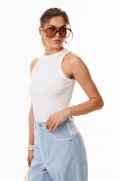 Джемпер выполнен из трикотажного полотна в рубчик. Джемпер приталенного силуэта, длиной выше линии бедер. Перед и спинка цельные. Горловина округлой формы. Плечевой шов заужен. Горловина и пройма обработаны бейками из основной ткани. Длина джемпера: р. 42-46 - 56 см, р. 48-54 - 58.