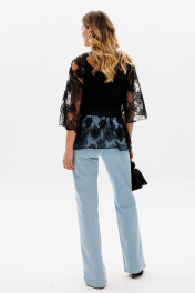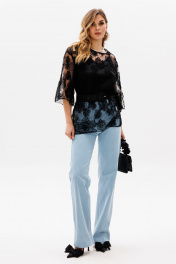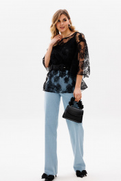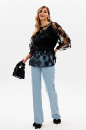 Брюки выполнены из джинса. Брюки прямого силуэта, на притачном поясе, длиной в пол. Спереди боковые карманы с фигурным входом. Застежка спереди на молнию с гульфиком и пробивную пуговицу. Сзади накладные карманы, декорированные нашивкой. Рекомендуется перед корректировкой длины изделие постирать. Длина брюк с поясом: р.42-46 - 115 см, р.48-52 - 116,5 см.