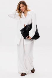 Брюки выполнены из плательно-блузочной ткани. Брюки покроя "палаццо".Спереди складки и застежка на потайную молнию. В боковых швах карманы. Брюки на подкладке в виде шорт. Пояс с эластичной тесьмой. Длина брюк: р. 42-46 - 112 см, 48-52 - 113 см.
