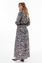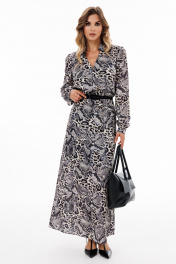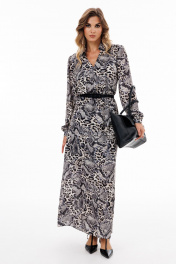 Платье выполнено из креп-шифон с анималистичным принтом.. Платье Х-образного силуэта, длиной миди. Платье отрезное по линии талии. Спереди средний шов и V-образная горловина. Воротник стояче-отложной с отрезной стойкой. Рукав втачной, одношовный. По окату рукава и низу сборка. Низ рукава на притачной манжете с застежкой на пуговицу. Юбка расширена к низу. По линии талии эластичная тесьма. Платье на отлетной по низу подкладке. В комплект входит ремень из отделочной черной ткани с обтяжной пряжкой. Длина платья:р.44-48 - 142 см, р. 50-54 - 143,5 см Длина рукава: р.44-48 - 65 см, р. 50-54 - 66 см ПЛАТЬЕ м. 2901 44 46 48 50 52 54 Длина по центру спинки 142 142 142 143,5 143,5 143,5 Длина рукава 65 65 65 66 66 66 Объем по груди 98 102 106 110 114 118 Объем по талии 60/96 64/100 68/104 72/108 76/112 80/116 Объем по бедрам 116 120 124 128 132 136 Объем по низу 158 162 166 170 174 178 Объем рукава вверху 38 40 42 42 44 46 Объем рукава внизу 20 20 20 21,5 21,5 21,5