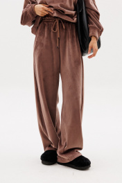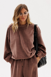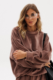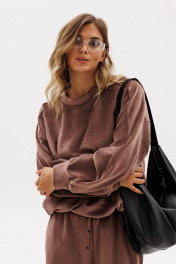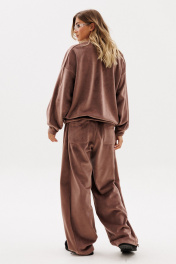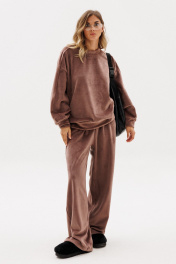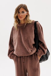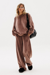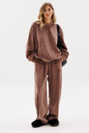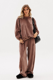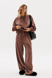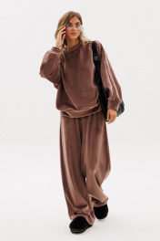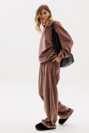 Комплект: джемпер+брюки. Комплект выполнен из двустороннего велюра в мелкий рубчик. Джемпер О-образного силуэта, покроя "oversize", длиной до линии бедер. Перед и спинка цельные. Горловина округлой формы, обработана бейкой. Плечевой шов удлинен. Рукав рубашечного покроя, одношовный. Низ рукава на манжете. Верхняя часть рукава переходит в кокетку переда т спинки и доходит до горловины. По низу джемпера обработан пояс. Пояс, манжеты, верхняя часть рукава и бейка горловины выполнены из основной, но без рубчика. Брюки на притачном поясе с эластичной тесьмой, прямого силуэта, длиной в пол, покроя "oversize". Боковой шов заменен лампасом. В швах лампаса карманы. Сзади накладные карманы. В пояс протянут шнур с наконечниками. По низу брюк втянута эластичная тесьма с фиксаторами. Лампасы и пояс выполнены из основной ткани, но без рубчика. Длина джемпера: р. 44-48 - 65 см, р. 50-54 - 66,5 см. Длина рукава от горловины: р. 44-48 - 76 см, р. 50-54 - 77 см. Длина брюк: р.44-48 - 109 см, р. 50-54 - 110 см Джемпер Длина по центру спинки 65 65 65 66,5 66,5 66,5 Длина рукава от горловины 76 76 76 77 77 77 Объем по груди 136 140 144 148 152 156 Объем по талии 130 134 138 142 146 150 Объем по низу 94 98 102 106 110 114 Объем рукава вверху 55 57 59 59 61 63 Объем рукава внизу 20 20 20 21,5 21,5 21,5 Брюки 44 46 48 50 52 54 Длина сбоку без пояса 109 109 109 110 110 110 Объем по талии 72/108 76/112 80/116 84/120 88/124 92/128 Объем по бедрам 118 122 126 130 134 138 Ширина пояса 5,5 5,5 5,5 5,5 5,5 5,5