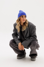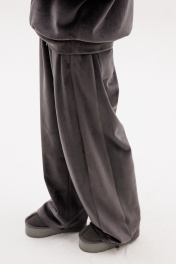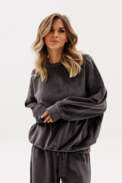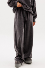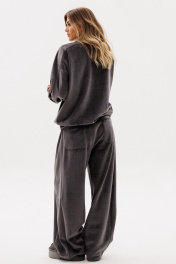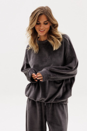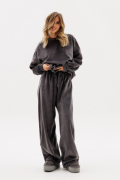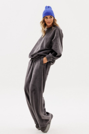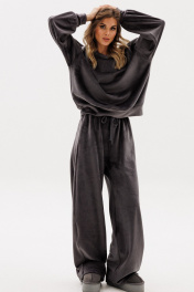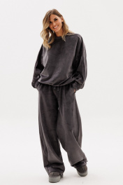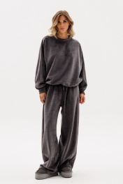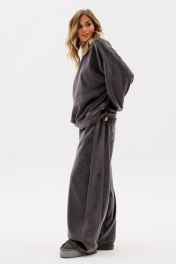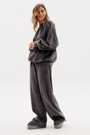 Комплект: джемпер+брюки. Комплект выполнен из двустороннего велюра в мелкий рубчик. Джемпер О-образного силуэта, покроя "oversize", длиной до линии бедер. Перед и спинка цельные. Горловина округлой формы, обработана бейкой. Плечевой шов удлинен. Рукав рубашечного покроя, одношовный. Низ рукава на манжете. Верхняя часть рукава переходит в кокетку переда т спинки и доходит до горловины. По низу джемпера обработан пояс. Пояс, манжеты, верхняя часть рукава и бейка горловины выполнены из основной, но без рубчика. Брюки на притачном поясе с эластичной тесьмой, прямого силуэта, длиной в пол, покроя "oversize". Боковой шов заменен лампасом. В швах лампаса карманы. Сзади накладные карманы. В пояс протянут шнур с наконечниками. По низу брюк втянута эластичная тесьма с фиксаторами. Лампасы и пояс выполнены из основной ткани, но без рубчика. Длина джемпера: р. 44-48 - 65 см, р. 50-54 - 66,5 см. Длина рукава от горловины: р. 44-48 - 76 см, р. 50-54 - 77 см. Длина брюк: р.44-48 - 109 см, р. 50-54 - 110 см Джемпер Длина по центру спинки 65 65 65 66,5 66,5 66,5 Длина рукава от горловины 76 76 76 77 77 77 Объем по груди 136 140 144 148 152 156 Объем по талии 130 134 138 142 146 150 Объем по низу 94 98 102 106 110 114 Объем рукава вверху 55 57 59 59 61 63 Объем рукава внизу 20 20 20 21,5 21,5 21,5 Брюки 44 46 48 50 52 54 Длина сбоку без пояса 109 109 109 110 110 110 Объем по талии 72/108 76/112 80/116 84/120 88/124 92/128 Объем по бедрам 118 122 126 130 134 138 Ширина пояса 5,5 5,5 5,5 5,5 5,5 5,5