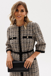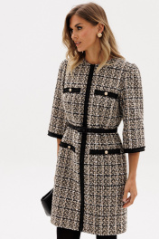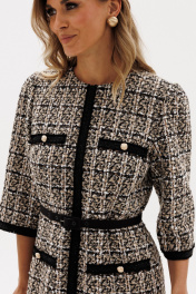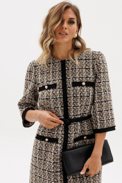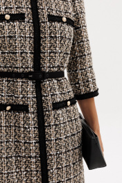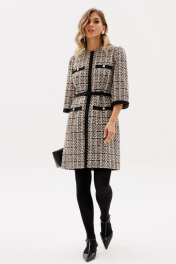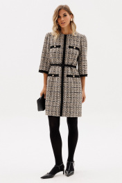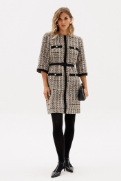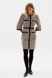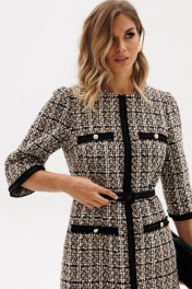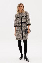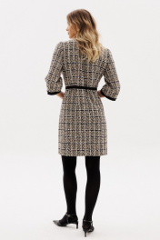 Платье выполнено из твида. Платье полуприлегающего силуэта, длиной выше линии колена. Застежка на потайную молнию в среднем шве спинки. Горловина округлой формы. Плечевой шов заужен. Рукав втачной одношовный, длиной 3/4. Платье декорировано настрочной тесьмой по центру переда, низу рукава. В комплект входит ремень из отделочной ткани с обтяжной пряжкой. Длина платья: р.44-48 - 89 см, р. 50-54 - 94 см. Длина рукава: р.44-48 - 56 см, р. 50-54 - 57,5 см. 44 46 48 50 52 54 Длина по центру спинки 89 89 89 94 94 94 Длина рукава от горловины 56 56 56 57,5 57,5 57,5 Объем по груди 96 100 104 108 112 116 Объем по талии 88 92 96 100 104 108 Объем по бедрам 105 109 113 117 121 125 Объем по низу 109 113 117 121 125 129 Объем рукава вверху 385 40 42 42 44 46 Объем рукава внизу 36 38 40 40 42 44
