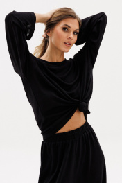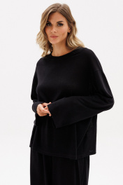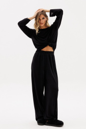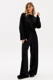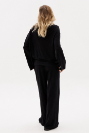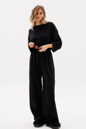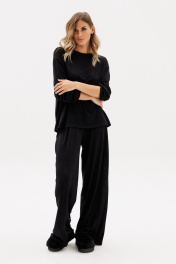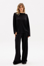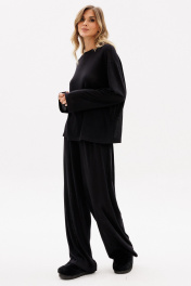 Комплект: джемпер + брюки. Комплект выполнен из трикотажного полотна. Джемпер прямого силуэта, длиной до линии бедра. Перед и спинка цельные. Горловина округлой формы, обработана широкой бейкой. Плечевой шов удлинен. Рукав рубашечного покроя, одношовный. Брюки прямого покроя, длиной в пол, на притачном поясе с эластиной тесьмой. Длина джемпера: р.44-48 - 63 см, р.50-54 - 64,5 см. Длина рукава от горловины: р.44-48 - 78 см, р.50-54 - 79 см. Длина брюкпо боковому шву: р.44-48 - 111 см, р.50-54 - 112 см. 44 46 48 50 52 54 ДЖЕМПЕР Длина по центру спинки 63 63 63 64,5 64,5 64,5 Длина рукава от горловины 78 78 78 79 79 79 Объем по груди 114 118 122 126 130 134 Объем по талии 110 114 118 122 126 130 Объем по низу 110 114 118 122 126 130 Объем рукава вверху 37,5 39,5 41,5 41,5 43,5 45,5 Объем рукава внизу 31 31 31 32,5 32,5 32,5 БРЮКИ Длина сбоку 111 111 111 112 112 112 Объем по талии 64/102 68/106 72/110 76/114 80/118 84/122 Объем по бедрам 110 114 118 122 126 130 Ширина пояса 4,5 4,5 4,5 4,5 4,5 4,5