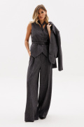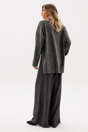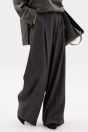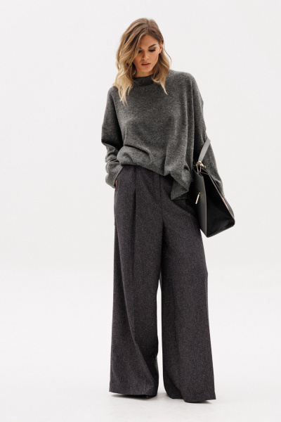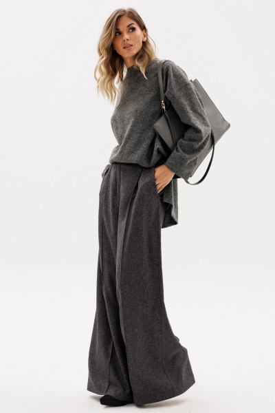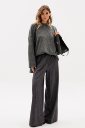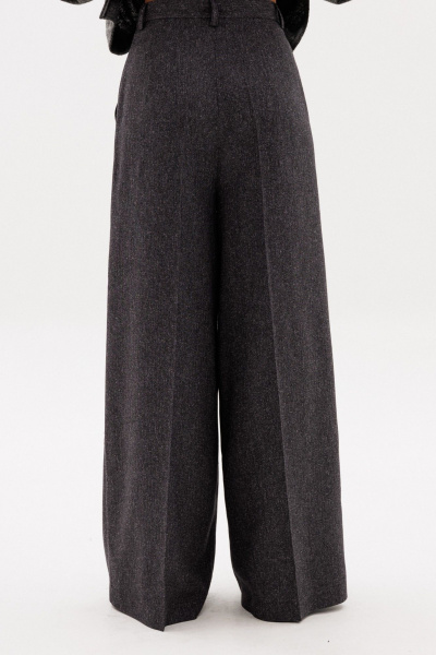 Брюки-палаццо выполнены из костюмной ткани меланж. Брюки на притачном поясе, длиной в пол, расширенные к низу. Спереди складки и боковые карманы с наклонным входом. Застежка спереди на молнию с гульфиком и пуговицу. На задних частях обработаны талиевые вытачки. Длина брюк: р. 44-48 - 111 см, р. 50-54 - 112 см 44 46 48 50 52 54 Длина сбоку 111 111 111 112 112 112 Объем по талии 73 77 81 85 89 93 Объем по бедрам 100 104 108 112 116 120 Ширина пояса 3,8 3,8 3,8 3,8 3,8 3,8