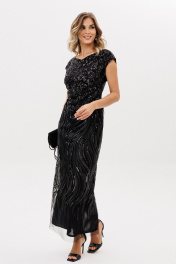 Платье выполнено из сетки с вышивкой с пайетками. В среднем шве спинки разрез и застежка на молнию с металлическими звеньями. Горловина и спинка выполнены в виде V-образной лодочки. Плечевой шов удлинен, образуя рукав цельнокроенного покроя. Платье на отлетной по низу подкладке. Длина платья: 134 см.