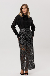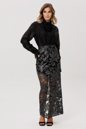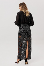 Юбка выполнена из сетки с вышивкой с пайетками. Юбка прямого силуэта, длиной миди. Юбка на притачном поясе, застегивающимя на петлю и пуговицу и на потайную молнию сзади в среднем шве. Юбка без подкладки. Длина юбки - 103 см. 42 44 46 Длина по переду с поясом 103 103 103 Объем по талии 68 72 76 Объем по бедрам 92 96 100 Объем по низу 84 88 92 Ширина пояса 4,5 4,5 4,5
