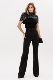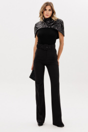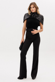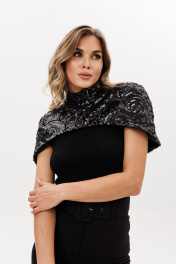 Кейп (накидка) выполнен из сетки с вышивкой с пайетками. Кейп прямого силуэта, длиной до линии груди. Перед цельный. Низ переда фигурной формы. Застежка на молнию с металлическими звеньями сзади в среднем шве спинки. Воротник-стойка. Кейп на притачной по низу подкладке из атласа, кейп с плечевыми накладками. Длина кейпа по переду: р.42-46 - 11см. р.48-52 -12,5 см. Длина кейпа по спинке: р.42-46 - 30 см. р.48-52 - 35 см. 42 44 46 48 50 52 Длина по центру спинки 30 30 30 35 35 35 Длина по центру переда 11 11 11 12,5 12,5 12,5