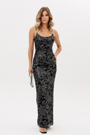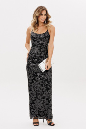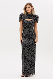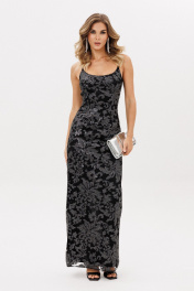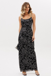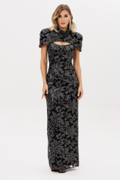Платье выполнено из костюмно-плательной ткани вышивка на сетке с пайетками. Платье приталенного силуэта длиной миди. Застежка на потайную молнию сзади в среднем шве спинки. Горловина округлой формы, углубленная. Сзади в среднем шве разрез. Платье на отлетной по низу подкладке. Длина платья -132 см. Гарантийный срок не установлен ГОСТ 25294 - 2003