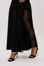 Юбка выполнена из плотного атласа. Юбка А-образного силуэта, на притачном поясе, длиной 7/8. Юбка выкроена по косой. Застежка в левом боковом шве на потайную молнию и пуговицу. По левому боку декоративная вставка из гипюра с фестонами. Юбка без подкладки. Длина юбки - 98 см. Гарантийный срок не установлен ГОСТ 25294 - 2003