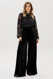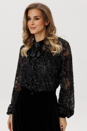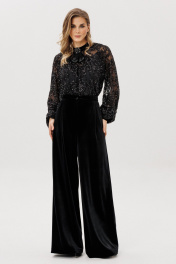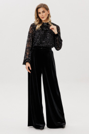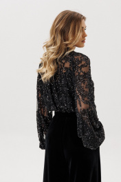 Блузка + топ. Блузка выполнена из сетки с вышивкой пайетками. Блузка прямого силуэта, длиной до линии бедер. Перед и спинка цельные, со сборкой по горловине. Воротник-стойка. Застежка сзади на две петли и пуговицы. Рукав покроя "реглан", одношовный, со сборкой по горловине и низу. Низ рукава на притачной манжете из велюра, застегивающейся на пуговицу. В комплект входит топ из трикотажной подкладки. Топ прямого силуэта, длиной до линии бедер, бретели регулируются по длине. В комплект входит декоративная брошь. Длина блузки: р.44-48 - 65 см, р.50-54 - 66,5 см. Длина рукава: р.44-48 - 76 см, 50-54 - 77 см. Гарантийный срок не установлен ГОСТ 25294 - 2003
