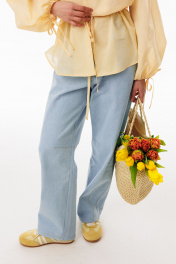 Джинсы-багги выполнены из плотного джинса. Брюки на притачном поясе, длиной до линии щиколотки, расширенные от бедер и слегка зауженные к низу. Спереди боковые карманы с фигурным входом. Застежка на пуговицу и молнию с гульфиком. На задних частях кокетки и накладные карманы. На передней и задней части коленные вытачки. Длина брюк: р.44-48 - 102 см, р. 50-54 - 103,5 см БРЮКИ м. 3043 44 46 48 50 52 54 Длина сбоку с поясом 102 102 102 103,5 103,5 103,5 Объем по талии 75 79 83 87 91 95 Объем по бедрам 106 110 114 118 122 126 Ширина пояса 4 4 4 4 4 4