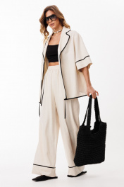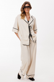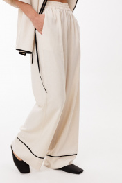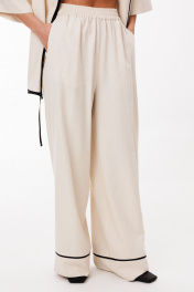 Брюки выполнены из льна. Брюки прямого силуэта, длиной в пол, на притачном поясе с эластичной тесьмой. На передних частях обработаны боковые карманы с наклонным входом. Низ брюк обработан притачной манжетой с кантом из отделочной ткани. Длина брюк: р.44-48 -110,5 см, р.50-54 - 111,5 см.