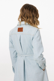 Платье выполнено из плотного джинса. Платье А-образного силуэта, длиной миди. Застежка спереди на металлические пробивные пуговицы. На спинке кокетка и встречная складка от нее. Воротник стояче-отложной с отрезной стойкой. Рукав втачной, одношовный, с прорезью и складками по низу. Низ рукава на манжете, застегивающейся на пуговицу. В боковых швах карманы. Платье декорировано нашивками из натуральной кожи по переду и спинке. В комплект входит ремень из сновной ткани с обтяжной пряжкой. Длина платья: р.42-46 -127 см, р.48-52 - 128,5 см. Длина рукава: р.42-46 - 63 см, р.48-52 - 64 см. ПЛАТЬЕ м. 3041 42 44 46 48 50 52 Длина по центру спинки 133 133 133 134,5 134,5 134,5 Длина рукава 64 64 64 65 65 65 Объем по груди 51 53 55 57 59 61 Объем по талии 49 51 53 55 57 59 Объем по бедрам 54 56 58 60 62 64 Объем по низу 74 76 78 80 82 84 Объем рукава вверху 32 34 36 38 40 42 Объем рукава внизу 22 22 22 24 24 24