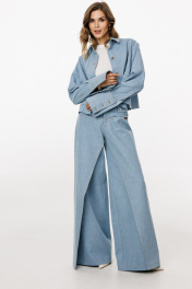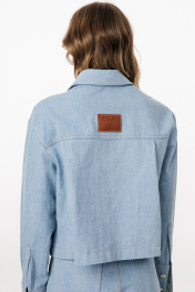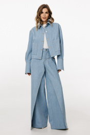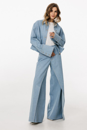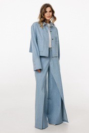 Блузка выполнена из плотного джинса. Блузка прямого силуэта, длиной ниже линии талии. Спереди накладные карманы и центральная застежка с планкой на пробивные пуговицы. На спинке кокетка и две складки. Воротник стояче-отложной с отрезной стойкой. Плечевой шов удлинен. Рукав рубашечного покроя, одношовный. Низ рукава на притачной манжете с застежкой на пробивные пуговицы. Рукав удлинен. Блузка декорирована по кокетке спинки нашивкой из натуральной кожи. Длина куртки: р. 44-48 - 49 см, р. 50-54 - 50.5 см. Длина рукава от горловины: р. 44-48 - 80 см, р. 50-54 - 81 см. БЛУЗКА м. 3042 44 46 48 50 52 54 Длина по центру спинки 49 49 49 50,5 50,5 50,5 Длина рукава от горловины 80 80 80 81 81 81 Объем по груди 116 120 124 128 132 136 Объем по талии 122 126 130 134 138 140 Объем по низу 124 128 132 136 140 144 Объем рукава вверху 37,5 39,5 41,5 41,5 43,5 45,5 Объем рукава внизу 25 25 25 27 27 27