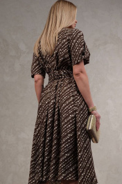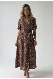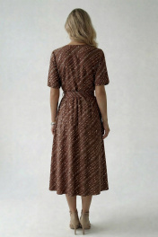 Платье длиной до середины икры А-силуэта, отрезное по линии талии. Фигурный вырез горловины переходит в пояс-завязку. Рукав короткий, в боковых швах кармана.