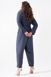 Комбинезон женский с имитацией двубортной застежки, воротником и лацканом пиджачного типа. Рукава двухшовные с открытой шлицей. Брюки в комбинезоне прямые, с ассиметричной застежкой на молнию и декоративными отворотами по низу. Комбинезон спереди застегивается на хлястик с полукольцами. На спинке комбинезон притален резинкой в кулиске. На брюках впереди - карманы с отрезным бочком.