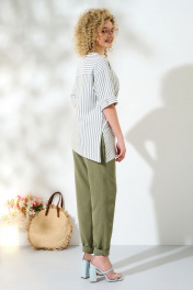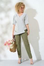 Костюм женский выполнен из льна-вишера. Костюм состоит из брюк и блузона. Брюки зауженные к низу на притачном поясе с резинкой. В боковых швах имеются функциональные карманы. Блузон из ткани в полоску с асимметричной молнией по переду. Горловина - асимметричная. Рукав – приспущенный с манжетам по низу. Спинка с кокеткой и складкой. Низ – асимметричный