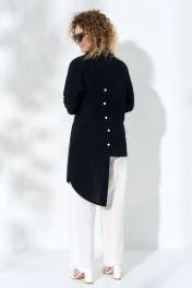 Костюм женский выполнен из хлопковой ткани, состоит из блузы и брюк. Блуза ассиметричного кроя, с полами разной длины. Горловина воротник-стойка. Рукав - кимоно с широкой подгибкой по низу. по переду изделия расположена планка с застежкой (петля-пуговица)- и нанесен принт, спинка изделия разрезная с застежкой петля-пуговица. Брюки на притачном поясе с резинкой, в боковых швах по низу изделия расположена функциональная кулиса позволяющая регулировать (присборивать)длину брюк по боковому шву.