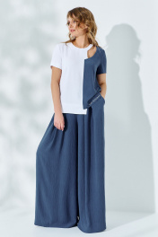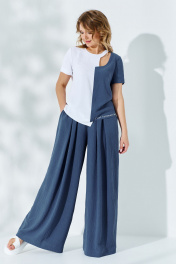 Костюм женский 2х предметный, состоит из брюк и блузона, блузон ассиметричного роя, разрезной по переду. Горловина округлая с небольшим вырезом. Рукав - втачной, короткий. Застежка- петля пуговица на спинке. Брюки завышенной посадки, расширенные к низу на притачном поясе с резинкой. В боковых швах брюк имеются карманы.