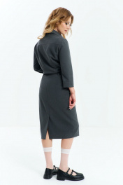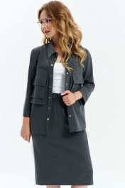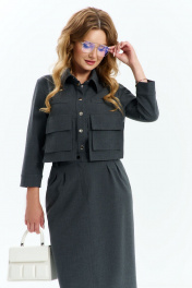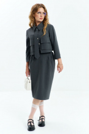 Костюм 3х предметный, состоит их рубашки, юбки, галстука. Выполнен из костюмной ткани. Рубашка прямого кроя без подкладки, по полочке расположены накладные декоративные элементы и карманы с клапаном. спинка с отрезной кокеткой и таллиевыми выточками. Воротник отложной на стойке, рукав втачной 7/8. Юбка изделия на притачном поясе с резинкой, застежка потайная молния, по низу юбки расположена шлица, юбка с подкладкой.