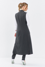 Женский брючный костюм двойка, состоящий из жилета и брюк. Жилет удлиненный, без подкладки. Горловина изделия воротник-стойка. Частичная застежка на пуговицы в области груди. Имеются нагрудные вытачки, обеспечивая комфортное прилегание. В области талии выполнены накладные карманы с декоративным элементом. В боковых швах по низу изделия разрезы, дополненные лентой. По спинке кокетка, средний шов и талевые вытачки. Брюки классические, комфортной посадки, зауженные к низу. Пояс - кокетка-обтачка со шлевками-кулисами, под декоративный ремень из ленты. Застежка на две пуговицы и молнию. В боковых швах брюк выполнены функциональные карманы. По задней половине брюк выполнена кокетка. Длина жилета по спинке – 116 см. Длина брюк по боковому шву - 96 см