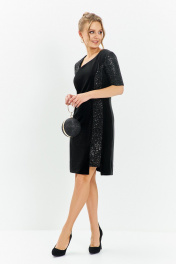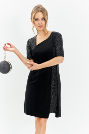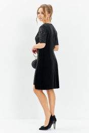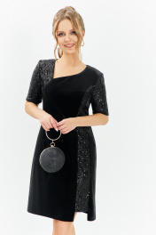 Платье женское приталенного силуэта, асимметричного кроя выполнено из сочетания бархатной ткани (велюр) и трикотажного полотна с пайеткоми. По переду изделия расположены рельефы и декоративная вставка из люрекса. Вырез горловины - фигурный асимметричный, рукав втачной короткий. Спинка платья с таллиевыми вытачками и потайной молнией
