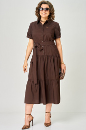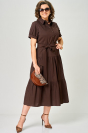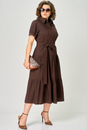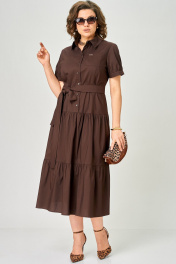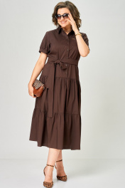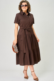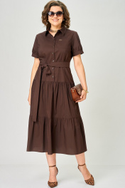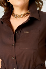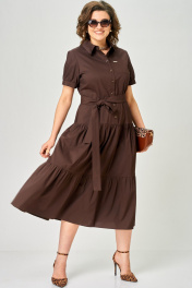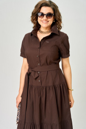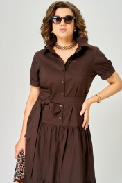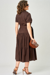 Платье женское повседневное полуприлегающего силуэта расширенное к низу за счет воланов. Выполнено из однотонного хлопка. Вырез горловины на стойке рубашечного типа, застежка на обметанные петли и пуговицы до первого волана. Рукав втачной по низу со соркой на притачной манжете. По правой строне полочки платья накладной карман с декоративной металлической нашивкой. Декором платья служит съемный пояс из основной ткани. Подходит на рост 164-170