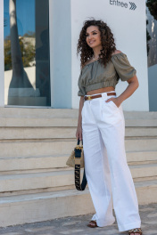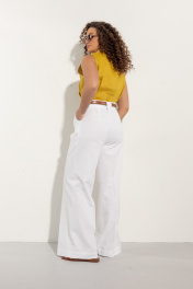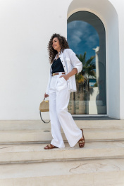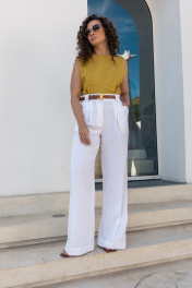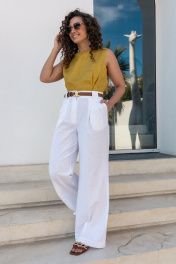 Белые брюки - бессменная классика, лучшего варианта для свидания или вечерней прогулки или офисного делового стиля. Льняные свободные брюки созданы для женщин, ценящих стиль и комфорт. Выполненные из натурального льна премиум-качества, они отлично пропускают воздух, обладают гигроскопическими свойствами, абсолютно аллергенны. Прикасаясь к коже, льняная ткань обеспечивает приятный микромассажный эффект. В носке брюки невероятно удобны - не сковывают движений, дарит ощущение уверенности в собственной привлекательности. Верхний срез брюк обработан притачным поясом с отрезными шлёвками, мягкие складки отлично скроют недостатки фигуры, сделают силуэт стройным и вытянутым, имеются карманы. В зависимости от создаваемого образа (делового, повседневного, романтичного) брюки можно сочетать с майками, топами, футболками, рубашками, пиджаками, жилетами. В качестве аксессуаров можно выбрать огромные или, наоборот, миниатюрные сумки, панамы из льна, соломенные шляпы, косынки, палантины. Не лишними будут бусы, браслеты, серьги, солнцезащитные очки.