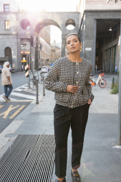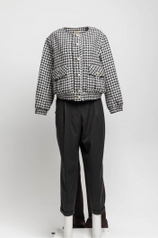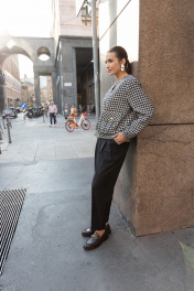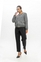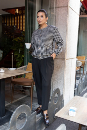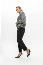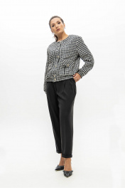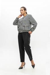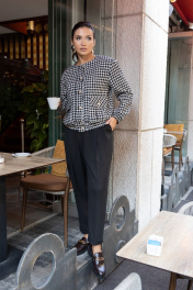 Костюм из приталенного жакета черно-молочной гусь-лапки и брюками-бананами (слоучи) может стать идеальной базой для офисного образа.