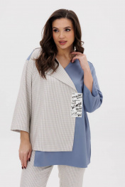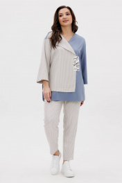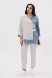 Комплект в стиле кэжуал. Свободный упрямленный силуэт с заниженной линией плеча, рукав втачной, расширенный. Полочка ассиметричная на запах с воротником апаш справа и обычным V-образным вырезом слева. Брюки в спортивном стиле, на эластичном поясе, слегка зауженные к низ, с наклонными боковыми карманами. Длина туники около 80 см. Длина рукава около 48 см. Длина брюк около 100см.