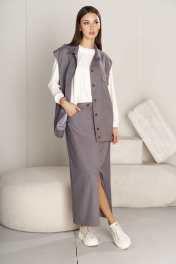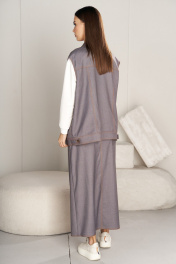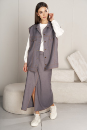 Каждый год мода меняется, но неизменным остаётся индивидуальное восприятие стиля, что позволяет формировать неповторимые образы с учётом последних тенденций и новинок одежды, но с акцентирующими внимание к деталям, комфорту и функциональности. Свободный оверсайз жилет из классической поливискозы в нестандартном, джинсовом крое с характерной отделкой. Полочки с отрезными кокетками, вертикальными рельефами, верхним карманом с клапаном и боковым карманом во 2-м рельефе. Спинка с отрезной кокеткой и вертикальными рельефами. Застёжка центральная на петли-пуговицы, воротник стояче-отложной. По низу жилета пояс с регулирующимися патами. Изделие полностью на подкладке. Длина жилета около 70 см. Юбка макси А-силуэта, с застёжкой и разрезом по центру переднего полотнища. Перед с боковыми карманами в джинсовом стиле и фигурным швом по центру. Заднее полотнище с центральным швом, отрезной кокеткой и накладными карманами. Пояс притачной. Длина юбки около 88 см.