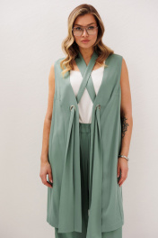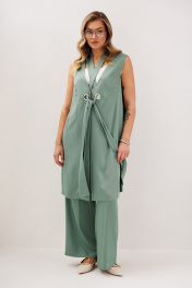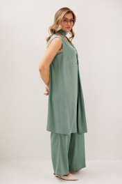 Комплекты в стиле кэжуал выбирает не только молодёжь: девушки в элегантном возрасте тоже ценят его за комфорт и индивидуальную свободу при создании своего образа. Уникальный симбиоз удобства и привлекательности. Свободный удлинённый жилет и комфортные брюки в расслабленном стиле. Жилет А-силуэта, без застёжки, с декоративными люверсами и отделочным шарфом. Полочка с боковым рельефом и нагрудной вытачкой. Спинка со средним швом и боковым рельефом. Брюки свободные, на эластичном поясе, с наклонными боковыми карманами. Длина жилета около 92 см. Длина брюк около 106 см.