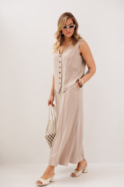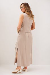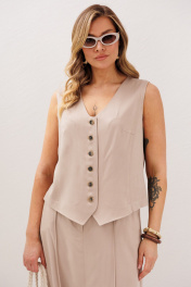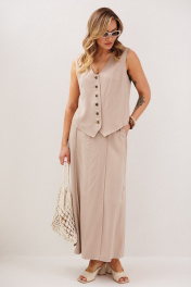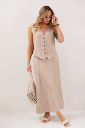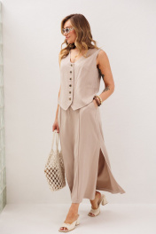 Костюм с жилетом - прекрасное решение для смелых экспериментов. Выполненный в нейтральной цветовой гамме, он позволяет дополнять себя различными аксессуарами и создавать каждый раз новые актуальные образы. Жилет полуприлегающего силуэта с центральной застёжкой и фигурным бортом. Полочка с боковым рельефом и нагрудной вытачкой. Спинка с центральным швом, боковым рельефом и талиевой вытачкой. Юбка А-образного силуэта с центральным швом с высоким разрезом по переднему полотнищу. Заднее полотнище с центральным швом, вытачками и застёжкой на тесьму-молнию. Пояс притачной с частично эластичными вставками. По боковым швам - наклонный карман. Длина юбки около 87 см, длина жилета около 52 см