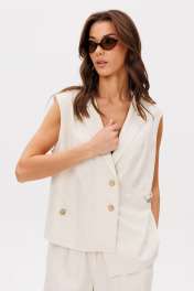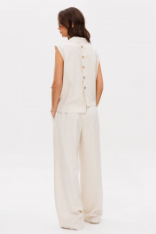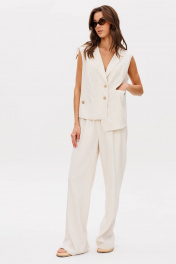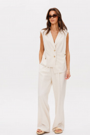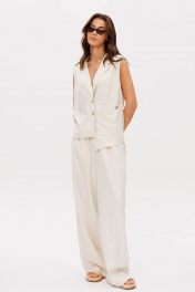 Костюм с жилетом - прекрасное решение для смелых экспериментов. Выполненный в нейтральной цветовой гамме, он позволяет дополнять себя различными аксессуарами и создавать каждый раз новые актуальные образы. Жилет прямого силуэта с центральной застёжкой и фигурным разноуровневым бортом. Спинка с декоративной разноуровневой планкой, которая имитирует застежку. Брюки прямые расслабленного стиля, на притачном эластичном поясе с наклонными боковыми карманами.
