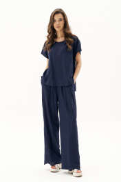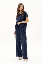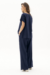 Брючный костюм из смесового льняного полотна с эффектной вышивкой. Он позволяет без усилий создать гармоничный образ, подчёркивая все ваши достоинства и минимизируя те особенности фигуры, которые вам хотелось бы скрыть. Комфортные брюки в расслабленном стиле на эластичном поясе с наклонными боковыми карманами и эффектными коническими вставками по боковому шву из вышитого полотна. Блуза свободная, покрой с заниженной линией плеча, рукав свободный, круглый вырез горловины и коническая вставка по центру переда. Спинка с центральным швом и застежкой- каплей. Низ изделия - разноуровневый. Длина брюк около 104 см. Длина блузы около 67 см. Длина рукава 12 см.
