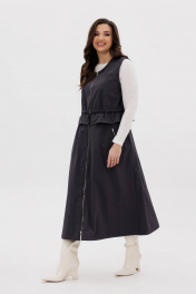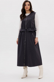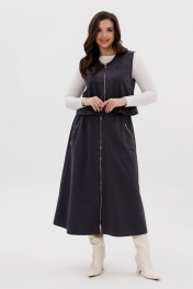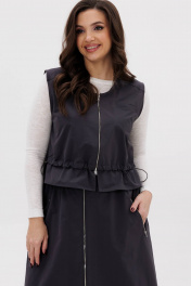 Костюм женский. Жилет свободный с центральной застёжкой на тесьму-молнию, кулисой чуть ниже линии талии, неширокой баской. Полочки с отрезной кокеткой и прорезным карманом с листочкой. Кулиса с эластичным шнуром и фиксаторами. Юбка коническая, на притачном эластичном поясе с дополнительным шнуром-резинкой и фиксатором. По переднему полотнищу - застёжка-молния и боковые карманы с отделочными молниями