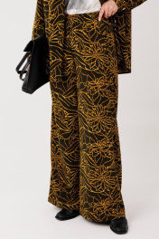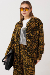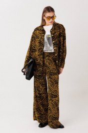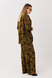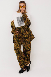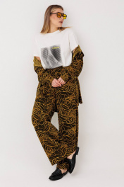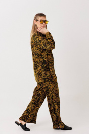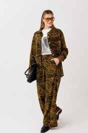 Брючный костюм, который с лёгкостью становится нарядным! Прежде всего, его выделяет роскошная ткань с геометрическим крупным рисунком, которая позволяет создать такой великолепный вариант брючного комплекта, который составит конкуренцию любому платью. Прямые линии, минимум декоративных элементов этот костюм как чистый лист, позволяет при помощи аксессуаров создать свои, неповторимые сеты. Свободная широкая рубашка и брюки-палаццо. Силуэт оверсайз, покрой рубашечный, воротник классический рубашечный с отрезной стойкой. Полоска, с отрезной кокеткой и накладным карманом. Спинка с отрезной кокеткой. Рукав с отрезной манжетой. Брюки на приточном поясе, эластичном в области спинки, с наклонными боковыми карманами. Длина рубашки около 75 см. Длина рукава с плечом около 74 см. Длина брюк около 108 см