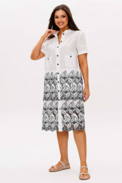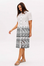 Платье из батиста, очень тонкое и практически не ощутимо ношении, в приоритете простота и удобство. Такой вариант всегда в моде. Белое платье с контрастной вышивкой и интересным кроем. Прямой силуэт, втачной покрой, центральная застежка на петли и пуговицы, воротник-стойка. Полочка и спинка двойные от линии талии до 3/4 бедра. Полочка с отрезной кокеткой со сборкой и накладными карманами. Спинка с отрезной кокеткой и сборкой. Модель дополнена Контрастными пуговицами. Длина платья около 107 см. Длина рукава около 22 см.