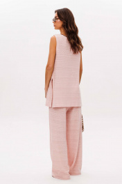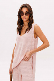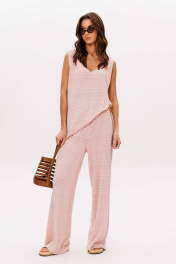 Есть очевидные причины, почему мы так любим трикотажные изделия: -они пластичны, легко принимают форму и ложатся по фигуре -приятны на ощупь -обладают великолепной терморегуляцией -не мнутся -не сковывают движения, в них уютно и комфортно -и наконец, это очень красиво! Поэтому, когда наступает долгожданный теплый сезон, вопроса, что мы будем носить, не возникает. Конечно же, практичный, модный, стильный и комфортный брючный комплект из ажурного х/б трикотажа. Туника свободная, без рукава, с V-образным вырезом и высокими боковыми разрезами. Брюки прямые, свободные, на эластичном поясе. Длина туники около 74см. Длина брюк около 104 см.