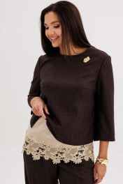 Утончённый и женственный костюм, созданный для особых случаев и стильных будней. Мягкое мерцание люрексовой нити в поливискозной ткани придаёт образу изысканное сияние, а продуманный крой обеспечивает идеальную посадку и комфорт. Главный акцент комплекта — нижний атласный топ с роскошной кружевной отделкой, создающий эффект многослойности и добавляющий наряду нотку романтичности. Верхняя блуза с рукавом ¾ лаконична и элегантна, а прямые брюки визуально вытягивают силуэт, делая образ стройнее и гармоничнее. Такой ансамбль станет отличным выбором для торжеств, встреч и особых случаев, когда хочется подчеркнуть вкус и женственность. Современная классика в лучших традициях элегантного стиля.
