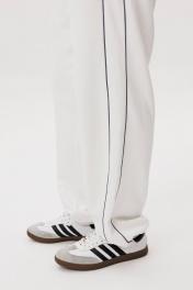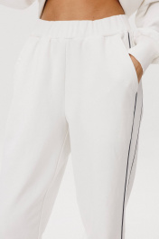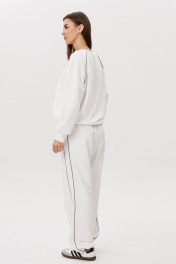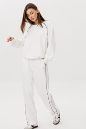 Спортивный костюм не предназначенный для занятия спортом, эдакая разновидность спортивной одежды в современной моде, выражающая характерную для спорта эстетику с помощью динамического кроя и отделки. Свободный свитшот покроя реглан с отделочными контрастными кантами по линии притачивая рукава и брендовой вышивкой на полочке. Брюки свободные, расслабленные, на эластичном поясе, с отрезным лампасом, декорированным отделочным кантом. По низу брюк-кулиса с эластичной тесьмой и фиксатором эффектно меняющая стиль брюк с прямого в "" алладины"". Длина свитшота около 60 см. Длина рукава около 60см. Длина брюк около 105 см.