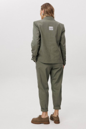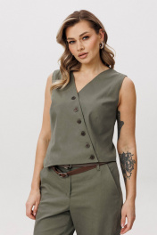 Современная брючная тройка, сочетающая продуманный крой и комфорт повседневного гардероба. Модель выполнена в стиле casual и подходит для динамичного городского ритма, сохраняя аккуратный и собранный внешний вид. Жакет отличается двубортной косой застёжкой, которая легко трансформируется в отложной лацкан. Лацкан фиксируется к полочке с помощью пуговиц, что позволяет менять характер образа — от более строгого к расслабленному. Жилет с асимметричной застёжкой и неровной линией низа добавляет образу архитектурность и подчёркивает дизайнерский подход. Брюки сложного кроя выполнены с цельнокроеным поясом спереди и притачным эластичным поясом на спинке, обеспечивающим комфортную посадку. Слегка зауженный книзу силуэт и наклонные боковые карманы формируют современную линию и визуально вытягивают фигуру. Костюм легко адаптируется под разные стилистические сценарии — от повседневных городских образов до smart casual, сочетаясь как с обувью на плоском ходу, так и с более акцентной парой. Ремень в комплект не входит!